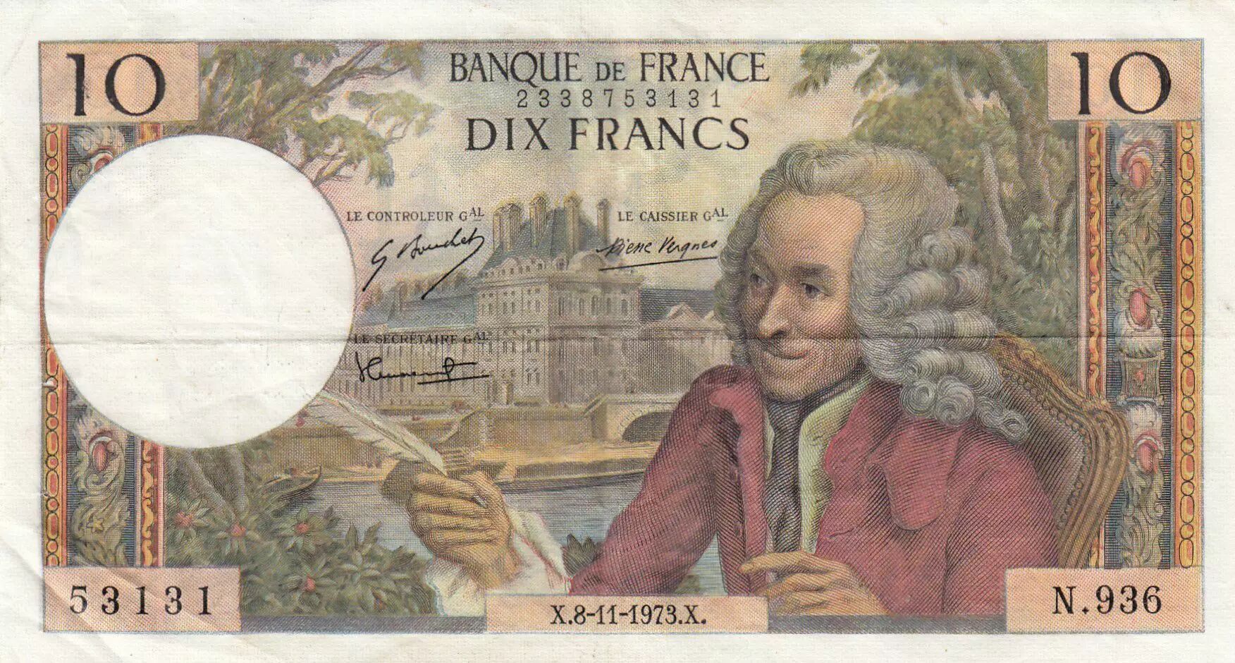 Home > > France 10 Francs Voltaire - 08-11-1973 Serial N.936