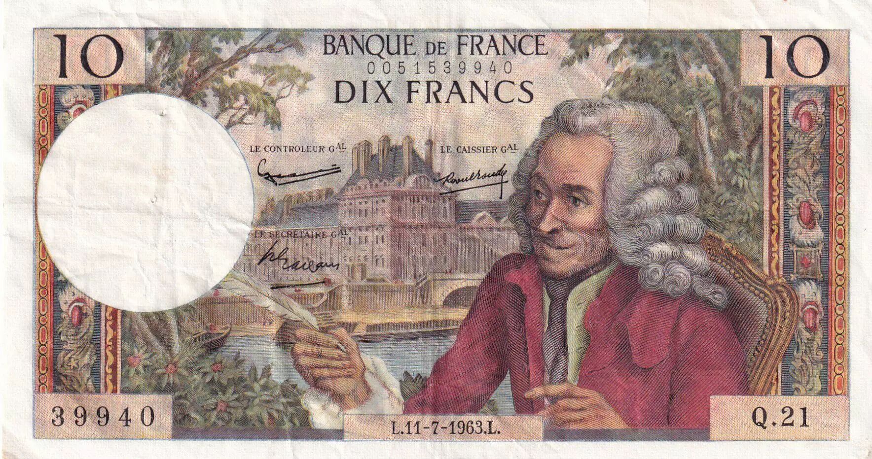Home > > France 10 Francs Voltaire - 11-07-1963 Serial Q.21 - VF