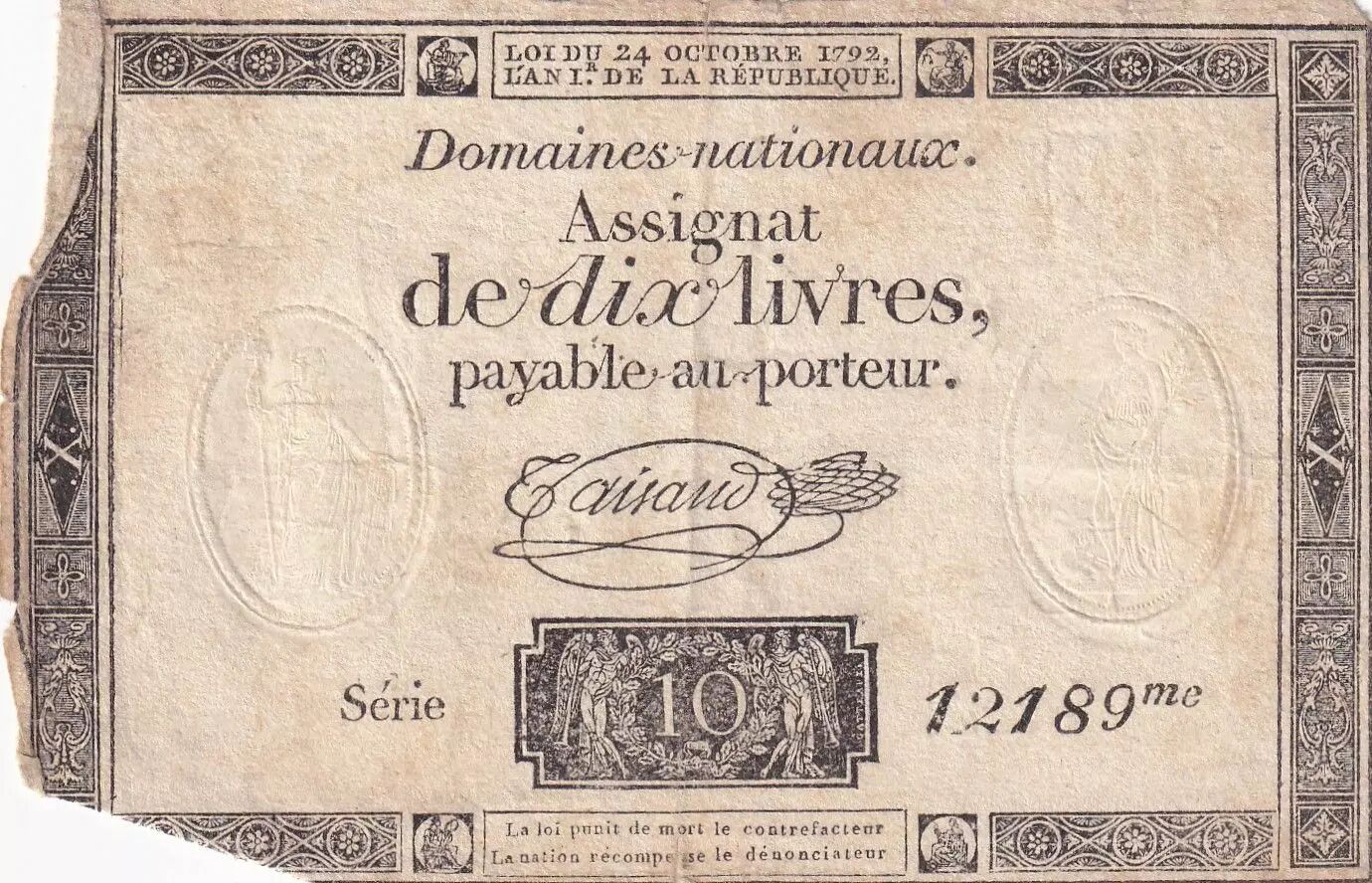 Banknote France 10 Livres Black on white Watermark Republique (24-10-1792) - Sign. Taisaud - Serial 12189
