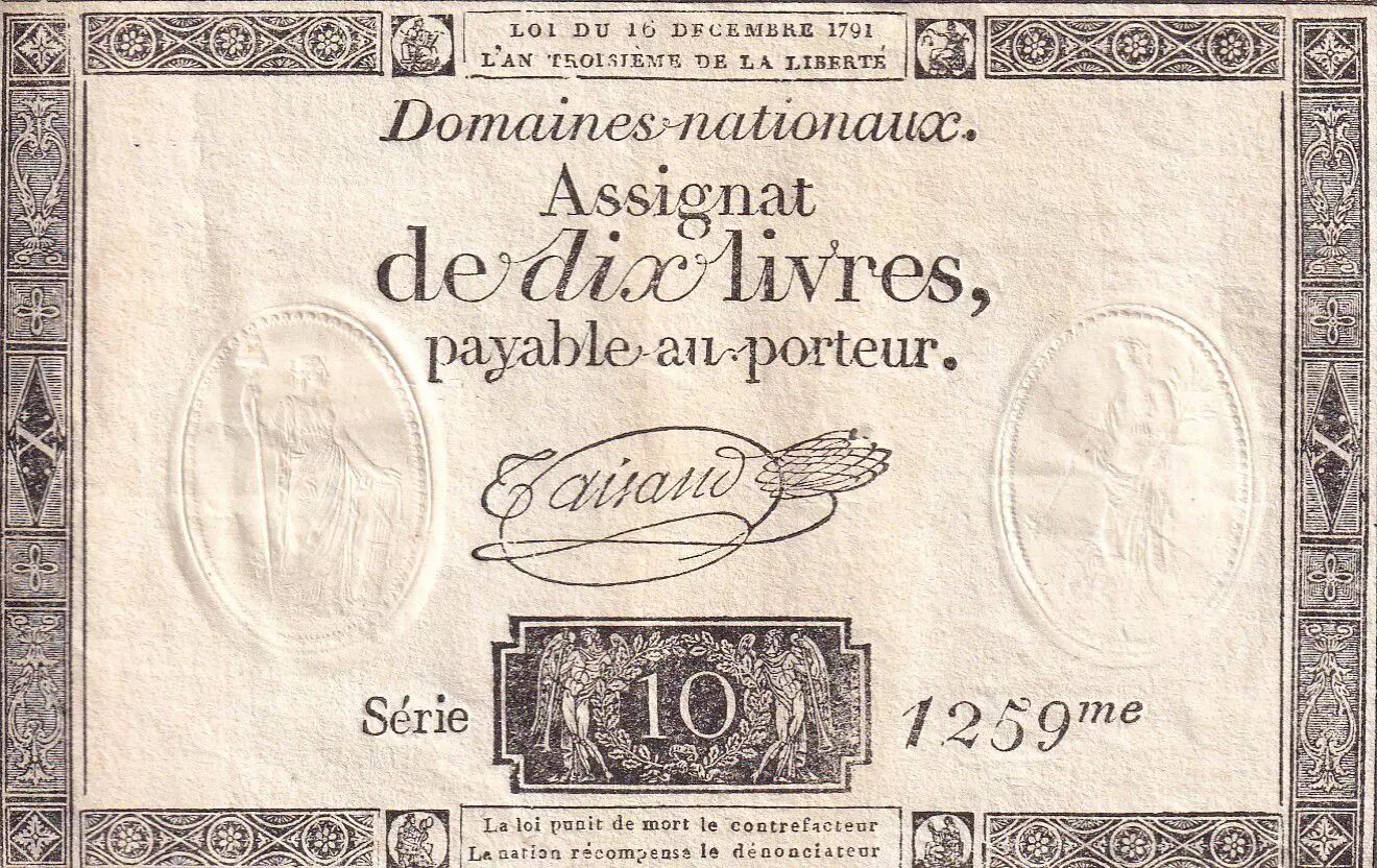 Banknote France 10 Livres Black - Watermark Fleur de Lys - (16-12-1791) - Sign. Taisaud - Serial 1259 - P. A.66