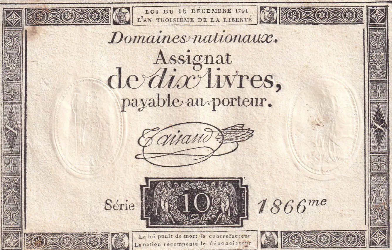 Banknote France 10 Livres Black - Watermark Fleur de Lys - (16-12-1791) - Sign. Taisaud - Serial 1866 - P. A.66