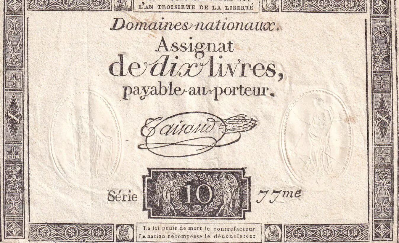 Banknote France 10 Livres Black - Watermark Fleur de Lys - (16-12-1791) - Sign. Taisaud - Serial 77 - P. A.66