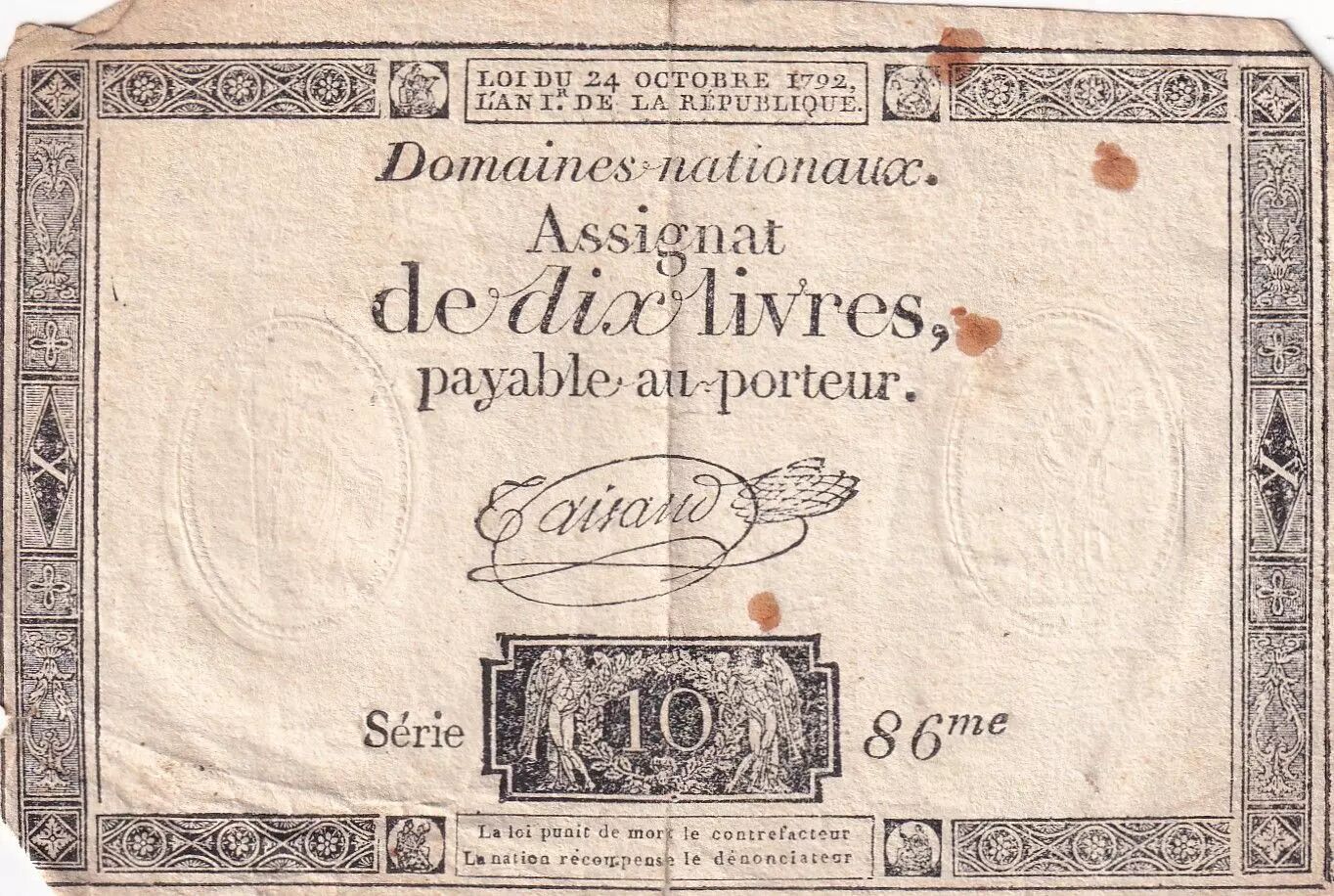 Banknote France 10 Livres Black - Watermark Fleur de Lys - (24-10-1792) - Sign. Taisaud - Serial 86