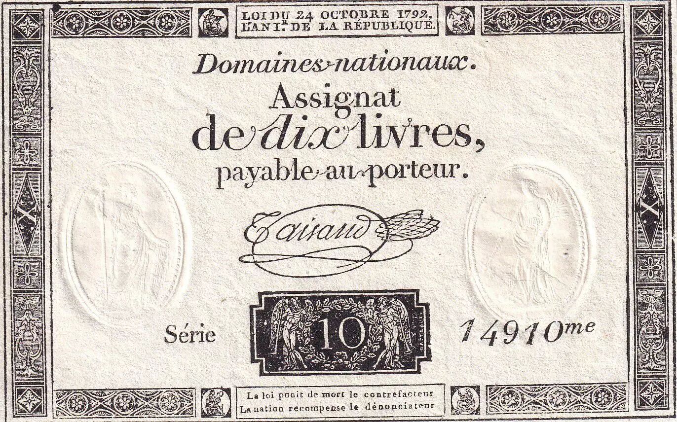 Home > French Banknotes > Assignats > 10 Livres Banknotes > France 10 Livres Black Watermark Republique (24-10-1792) - AU - French Revolution