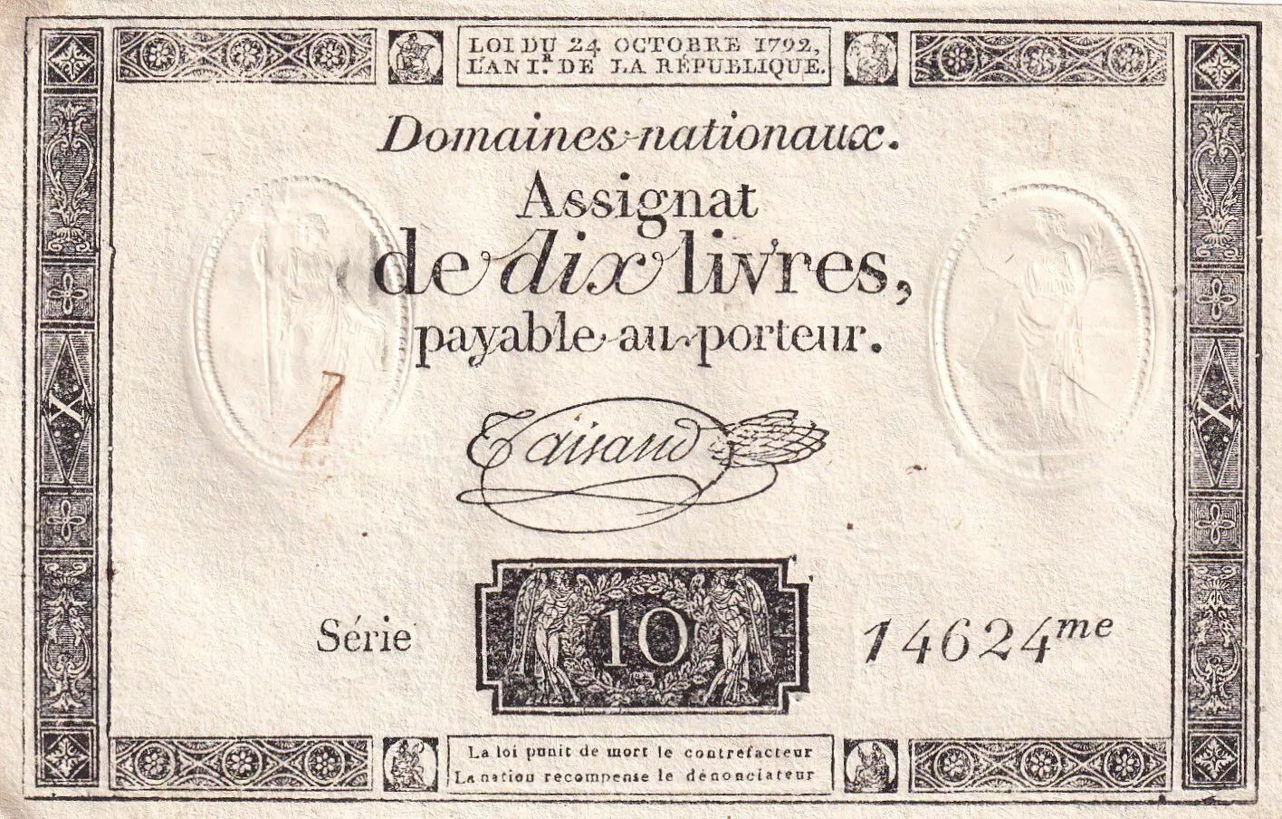 Banknote France 10 Livres Black Watermark Republique (24-10-1792) - Serial 14624 -- French Revolution