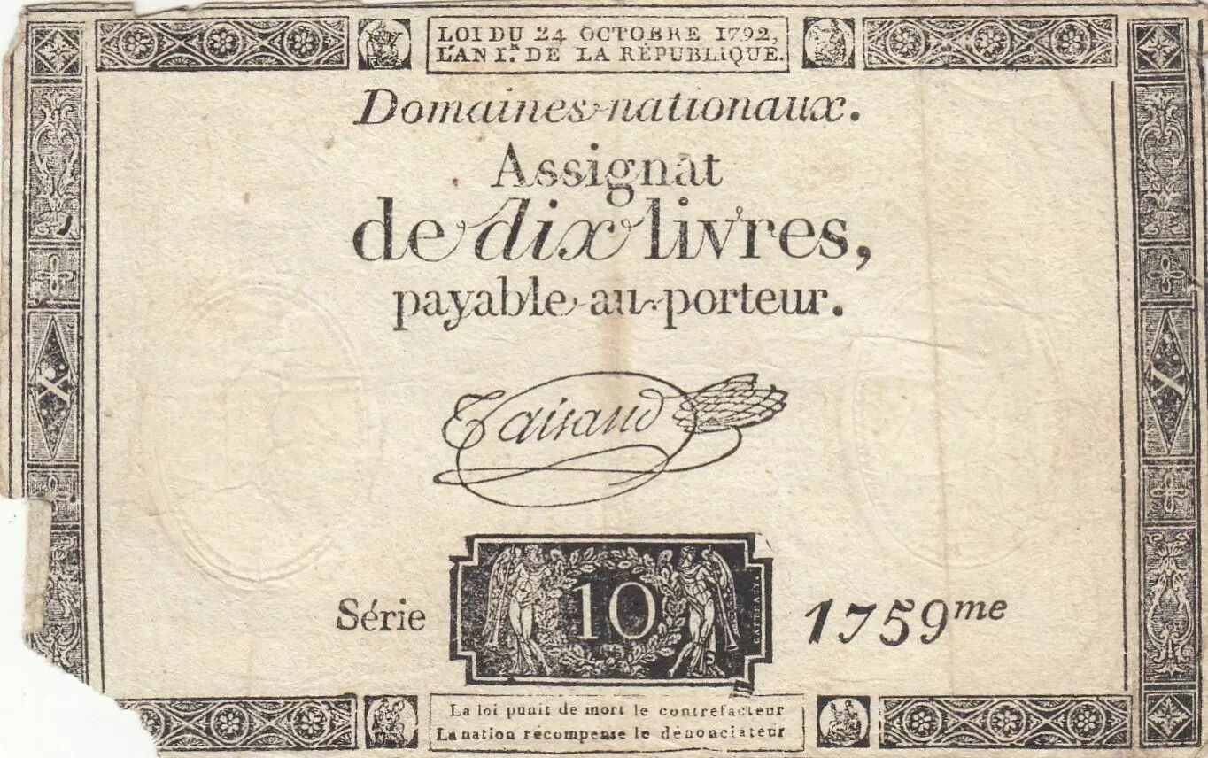 Billet France 10 Livres - Filigrane Fleur de Lys - 24-10-1792 - Sign. Taisaud - Série 1759