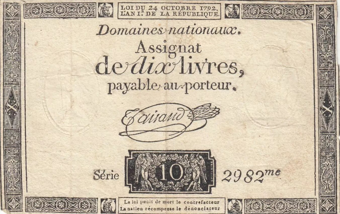 Accueil > Billets Français > Assignats > 10 Livres > France 10 Livres - Filigrane Fleur de Lys - 24-10-1792 - Sign. Taisaud - Série 2982