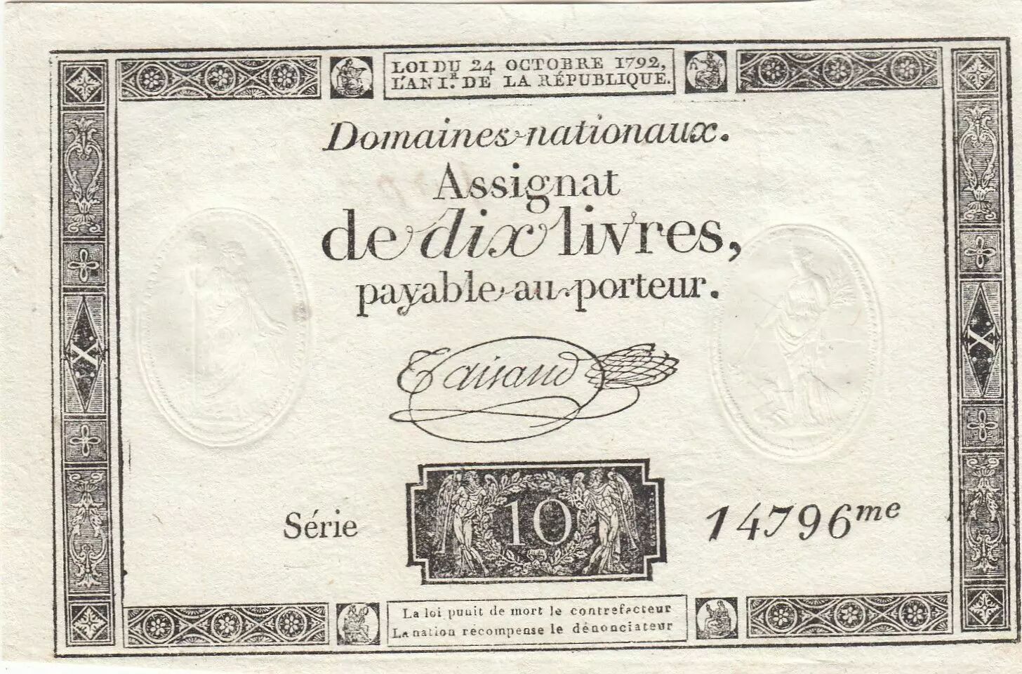 Billet France 10 Livres - Filigrane République - Sign. Taisaud - 24-10-1792 - Série 14796