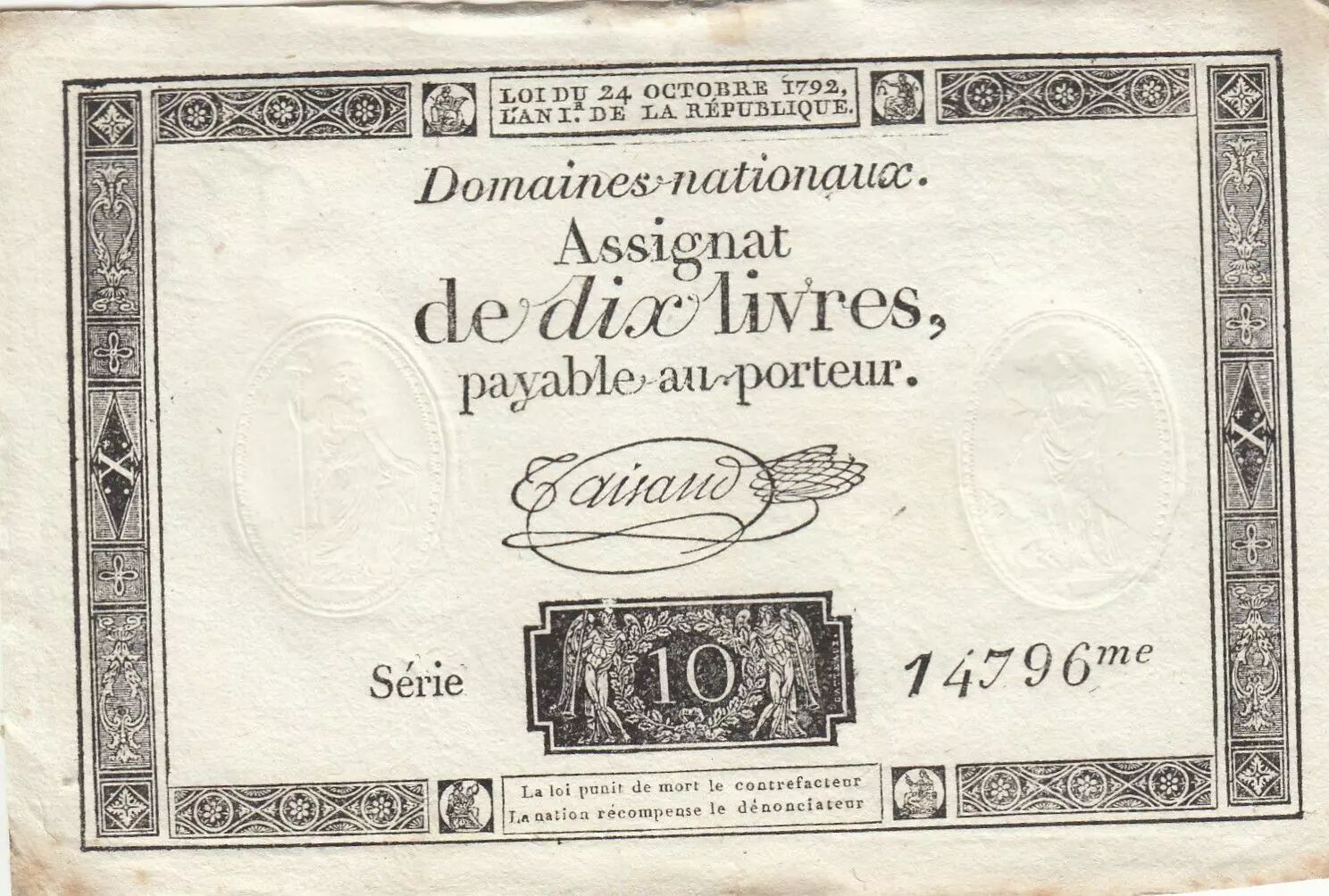 Billet France 10 Livres - Filigrane République - Sign. Taisaud - 24-10-1792 - Série 14796