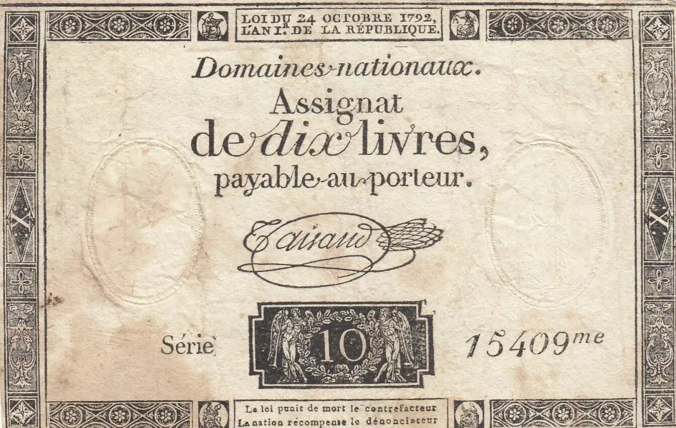 Billet France 10 Livres - Filigrane République - Sign. Taisaud - 24-10-1792 - Série 15409