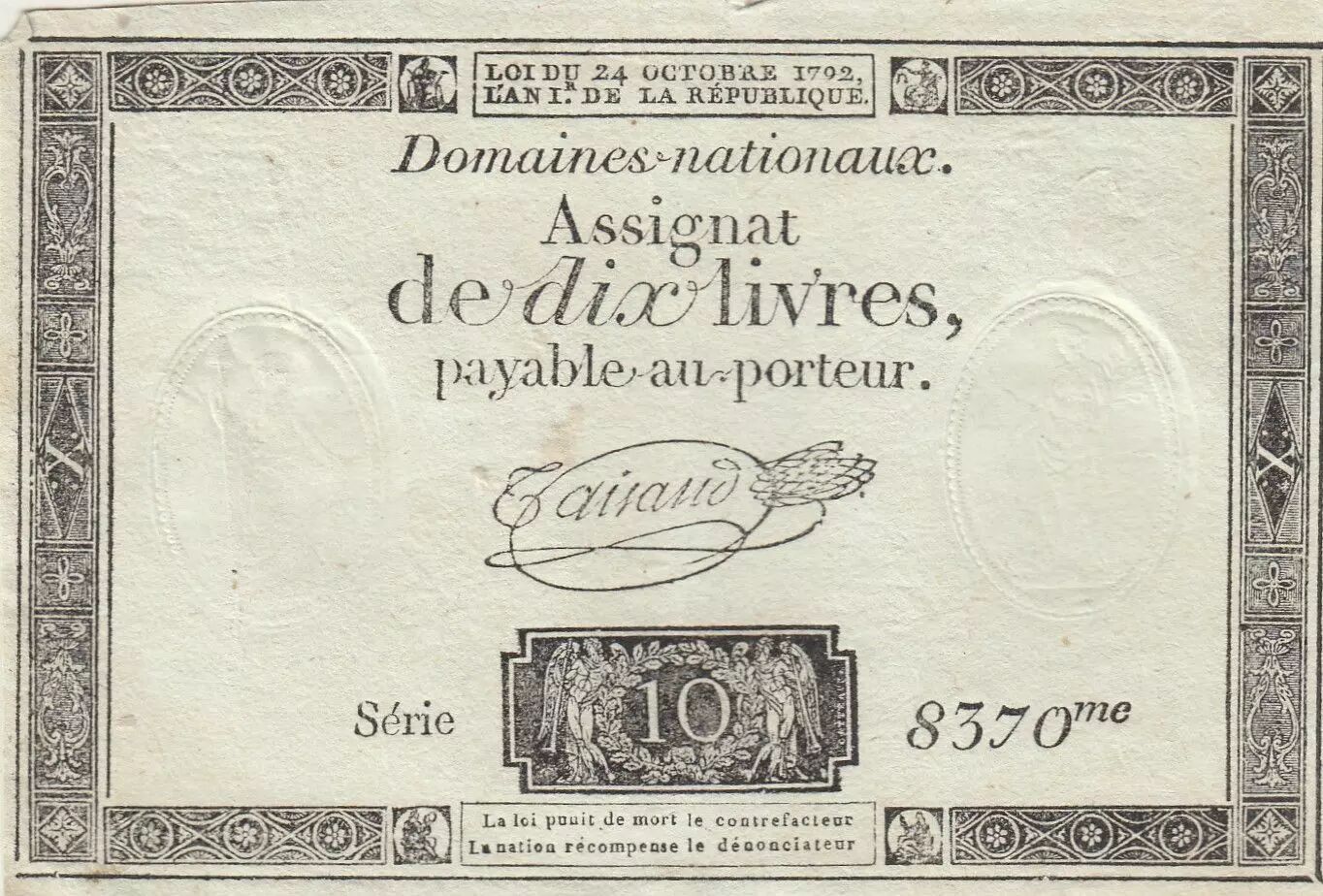 Billet France 10 Livres - Filigrane République - Sign. Taisaud - 24-10-1792 - Série 8370