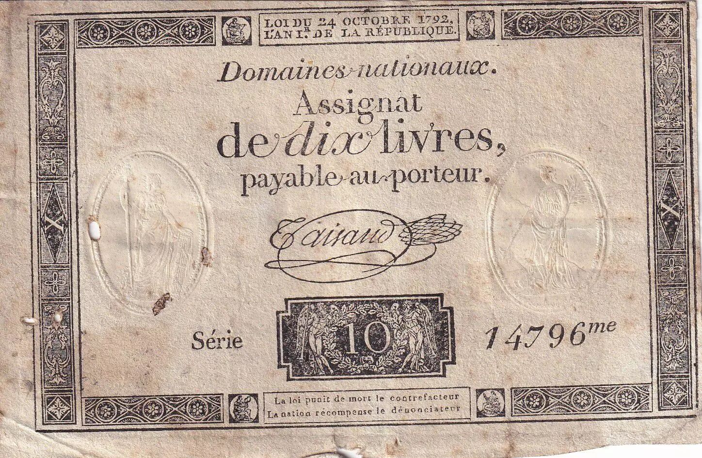 Billet France 10 Livres Noir - (24-10-1792) - Sign. Taisaud - Série variées - L.161b