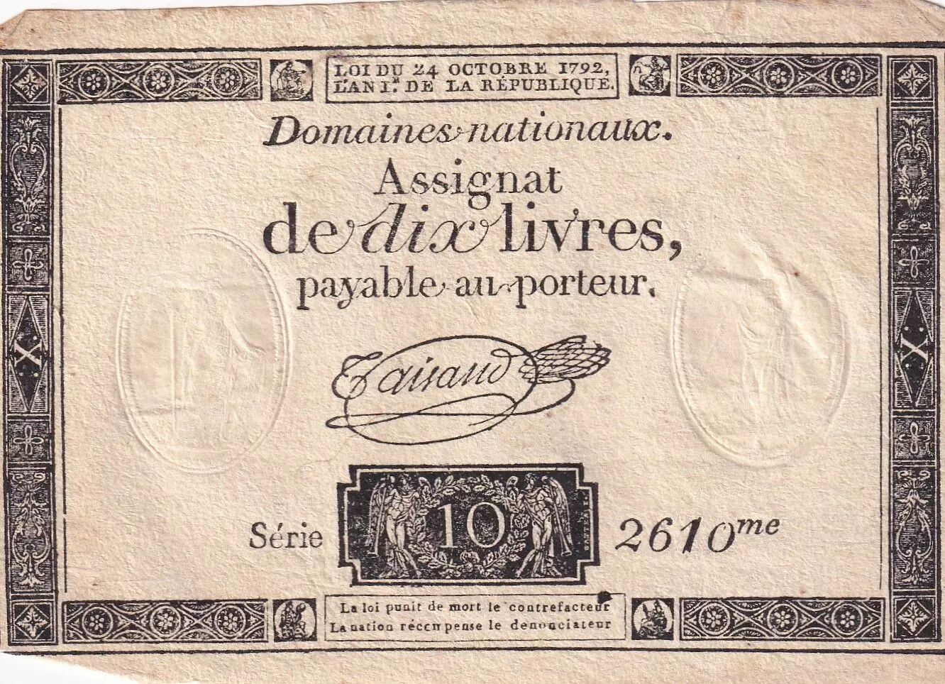 Accueil > Billets Français > Assignats > 10 Livres > France 10 Livres Noir - Filigrane Fleur de Lys - (24-10-1792) - Sign. Taisaud - Série 2610