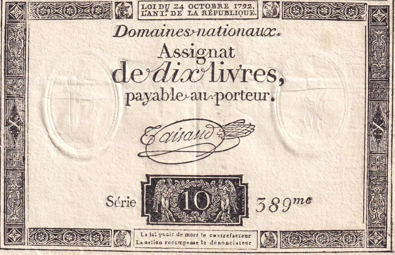 Billet France 10 Livres Noir - Filigrane Fleur de Lys - (24-10-1792) - Sign. Taisaud - Série 389 - L.161a