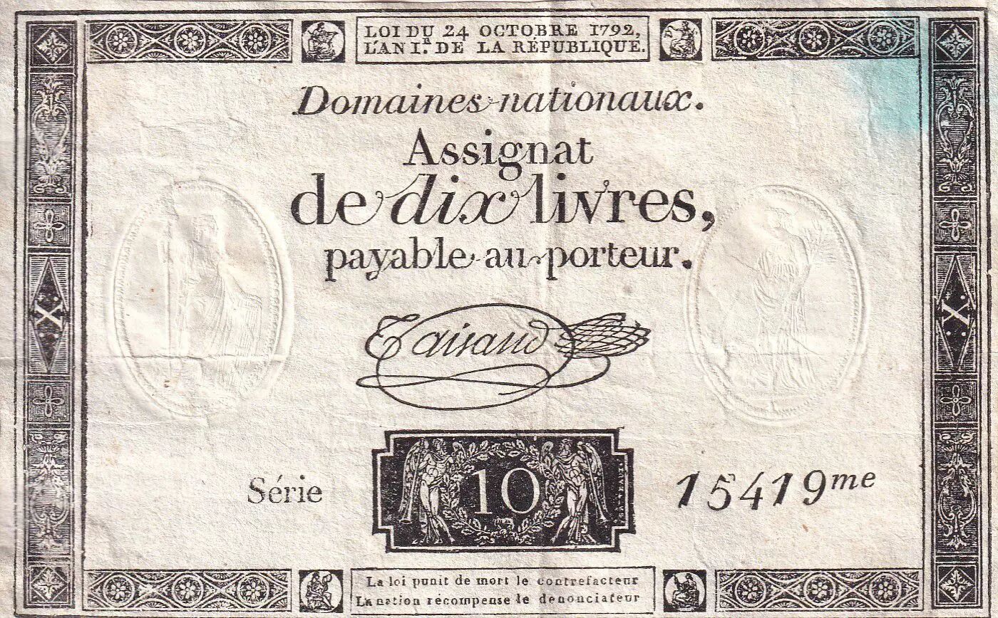 Billet France 10 Livres Noir - Filigrane République - (24-10-1792) - Sign. Taisaud - Série 15419 - L.161b