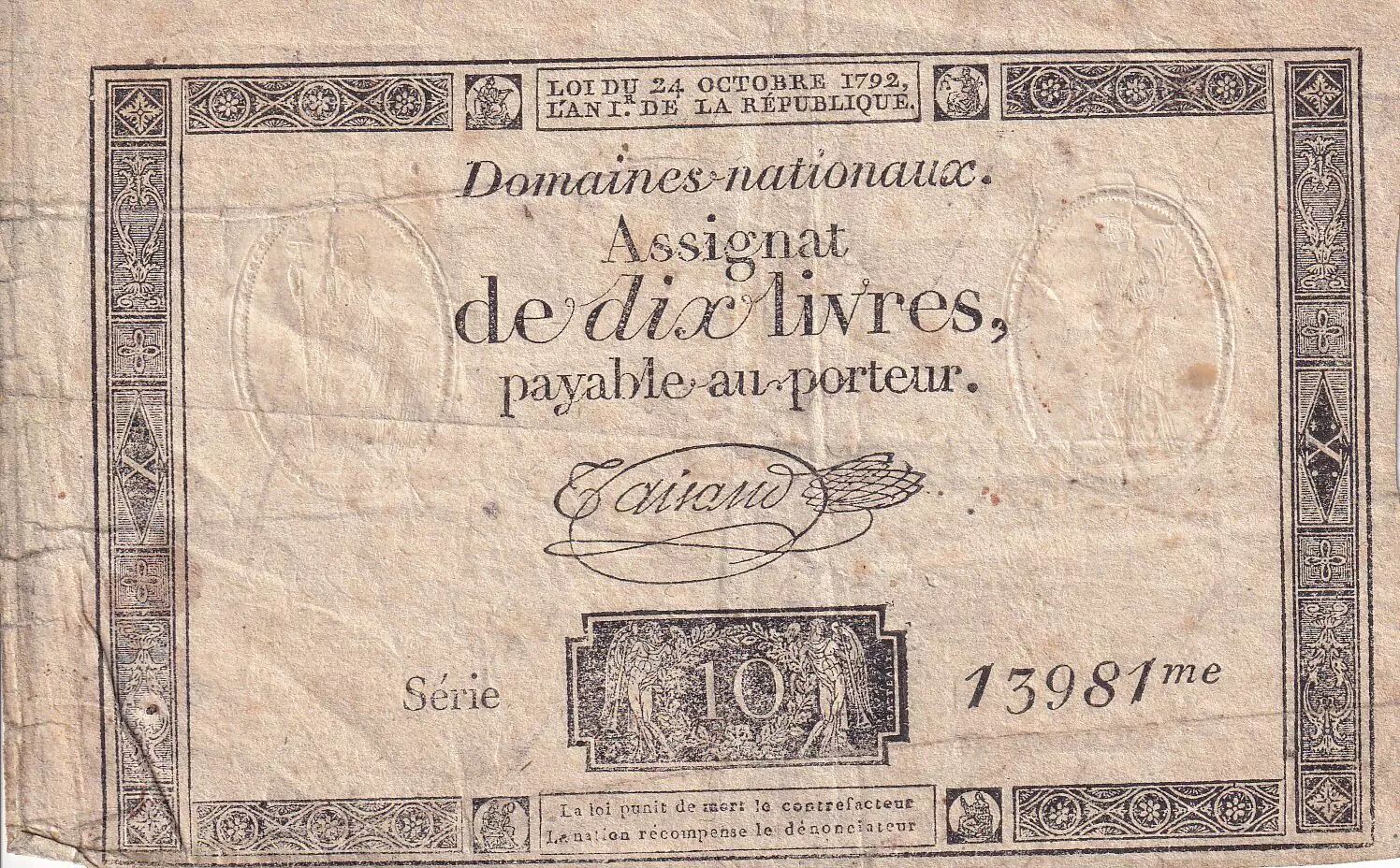 Accueil > Archivage > France 10 Livres Noir - Filigrane République (24-10-1792) - TB+ - Sign. Taisaud