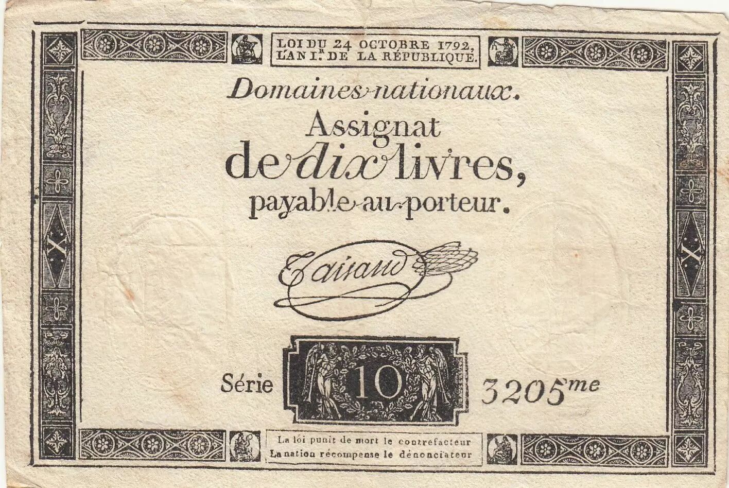 Banknote France 10 Livres - Watermark Fleur de Lys - 24-10-1792 - Sign. Taisaud - Serial 3205