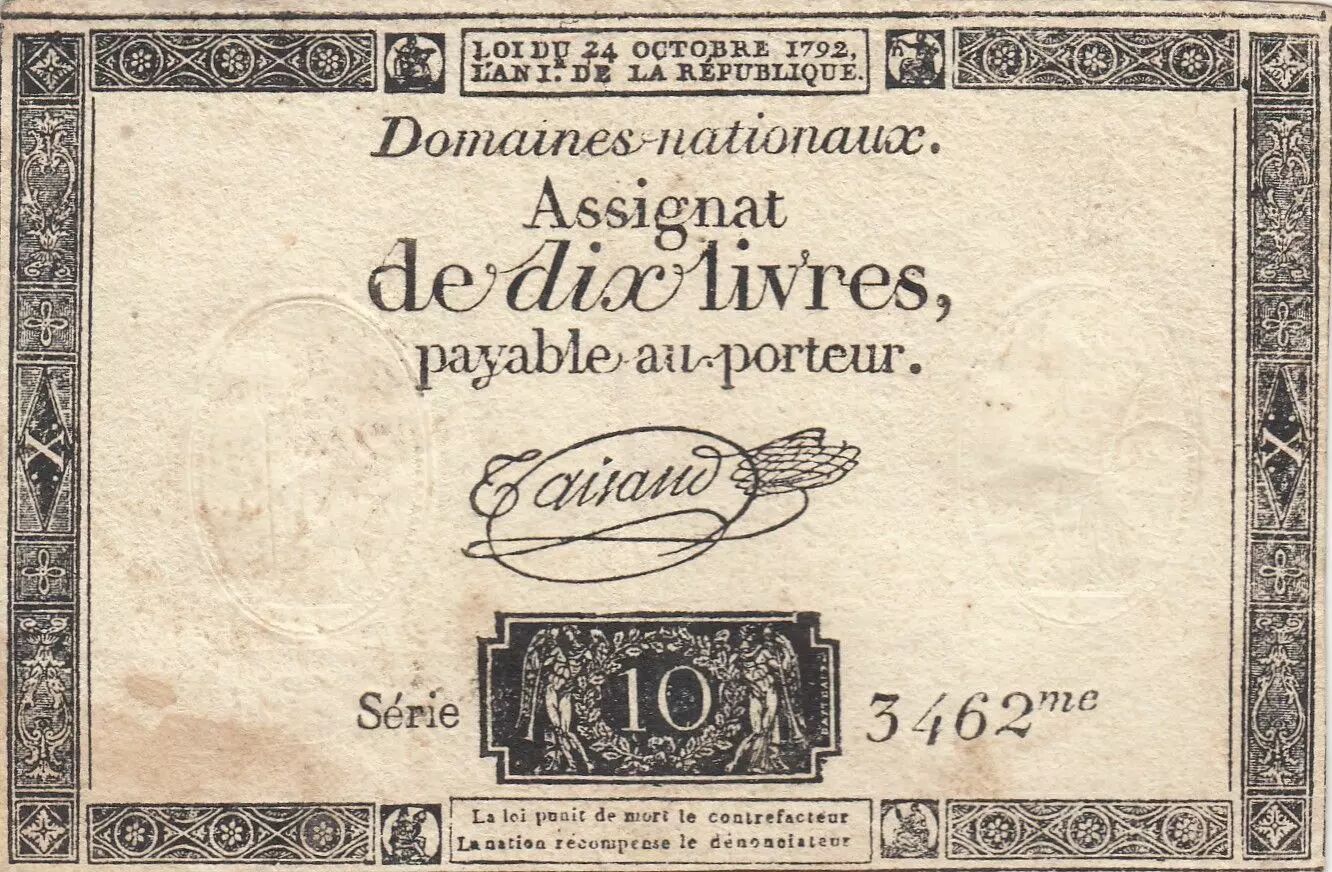 Banknote France 10 Livres - Watermark Fleur de Lys - 24-10-1792 - Sign. Taisaud - Serial 3462