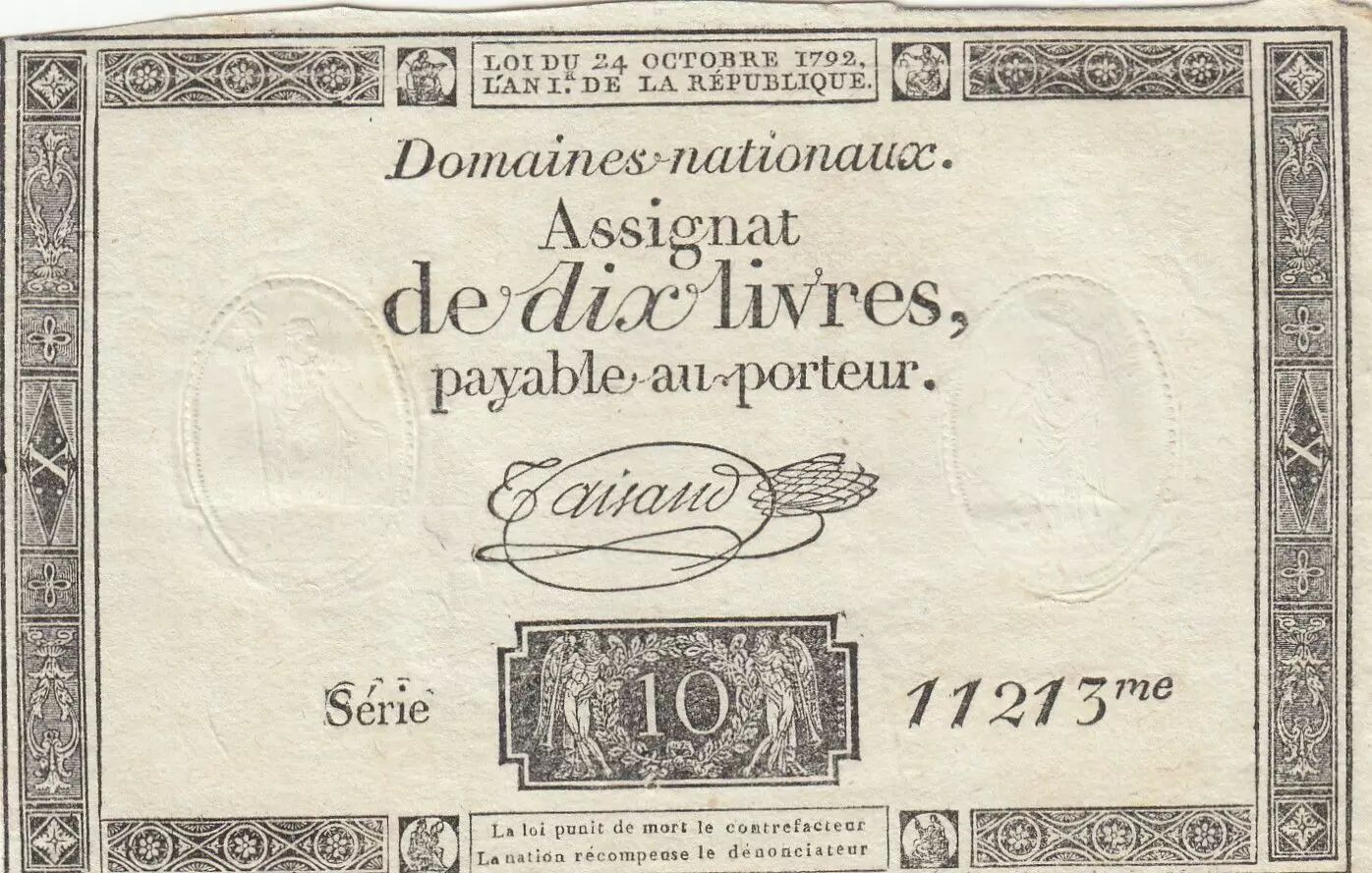 Banknote France 10 Livres - Watermark Republique - French Revolution - 24-10-1792 - Serial 11213