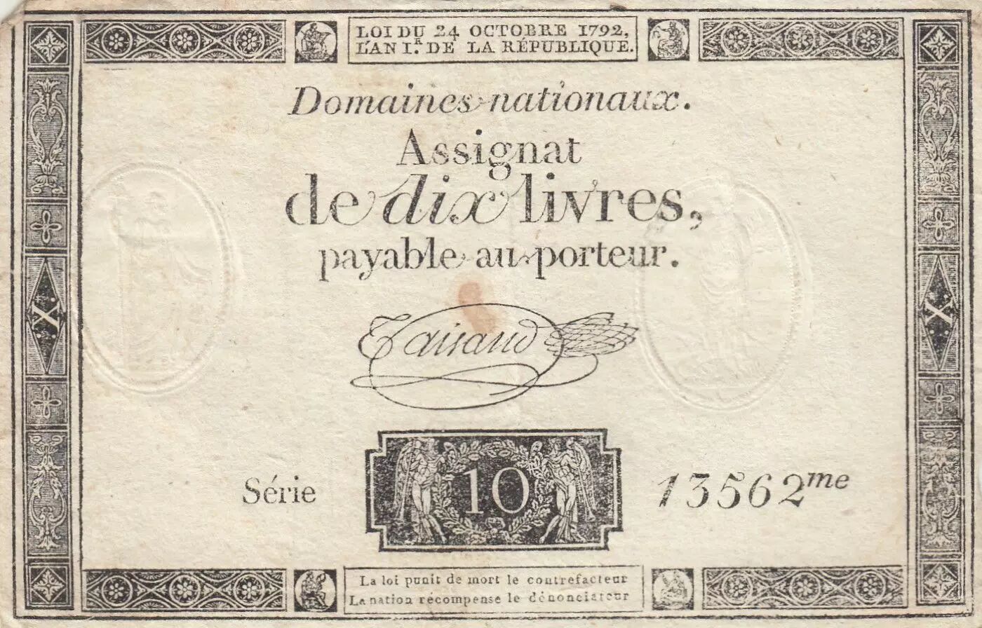 Banknote France 10 Livres - Watermark Republique - French Revolution - 24-10-1792 - Serial 13562