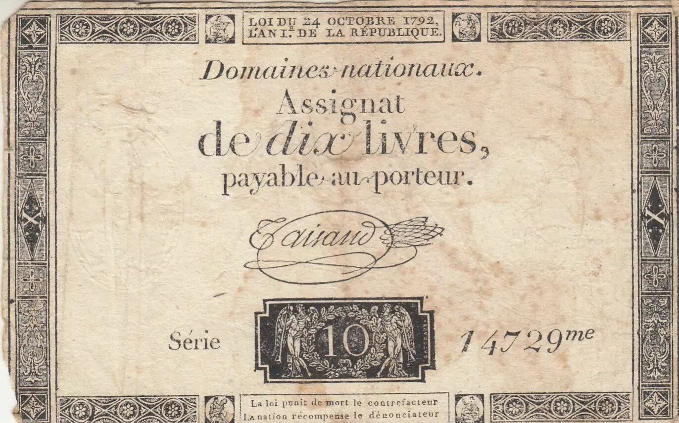 Banknote France 10 Livres - Watermark Republique - French Revolution - 24-10-1792 - Serial 14729