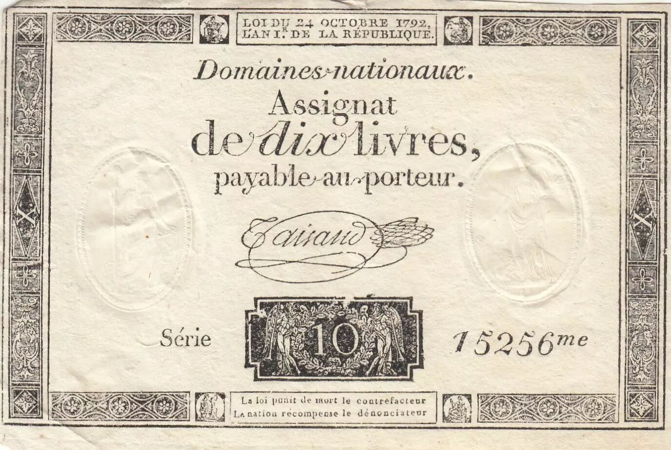 Banknote France 10 Livres - Watermark Republique - French Revolution - 24-10-1792 - Serial 15256