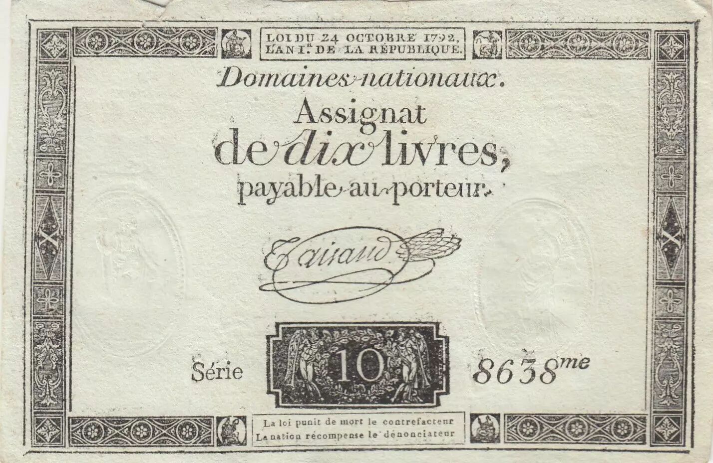 Banknote France 10 Livres - Watermark Republique - French Revolution - 24-10-1792 - Serial 8638