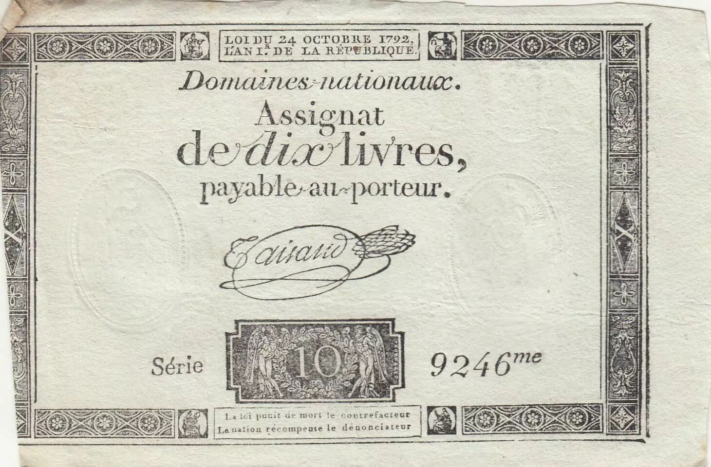 Banknote France 10 Livres - Watermark Republique - French Revolution - 24-10-1792 - Serial 9246