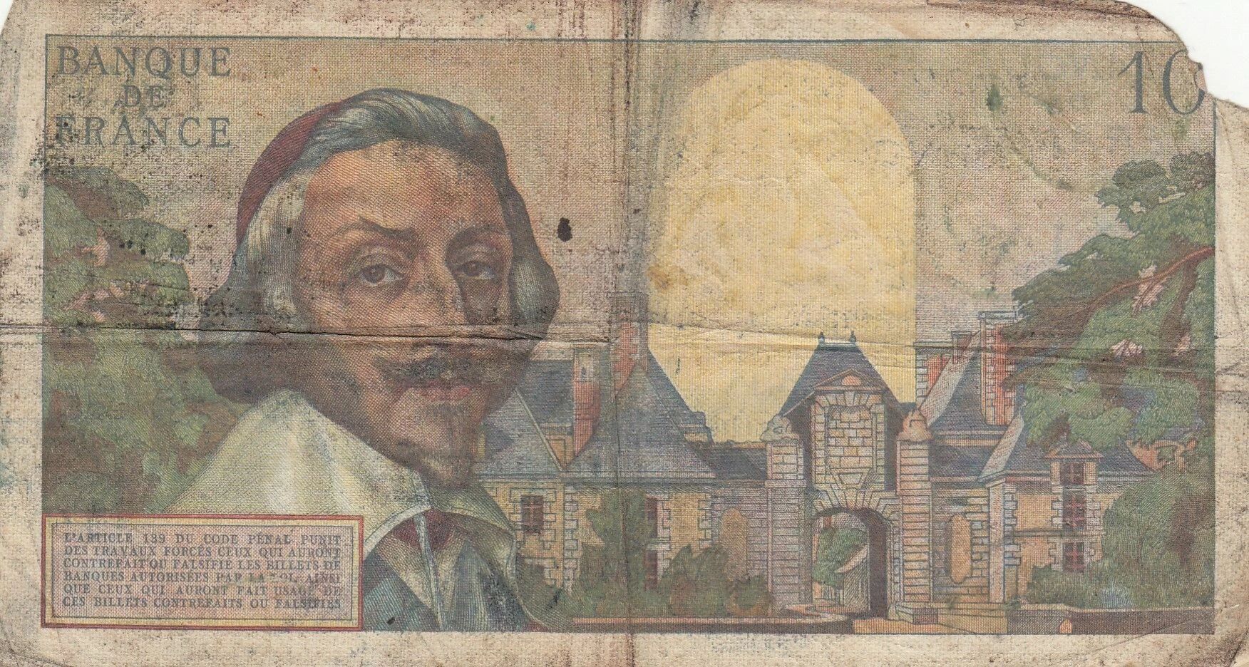 On the front of the banknote, the portrait of Cardinal Richelieu occupies a central place. He is depicted in ceremonial attire, with his cardinal's biretta and red robe. The background features classic architectural elements, evoking the Palais Cardinal, later the Palais Royal. The face value, "10 Nouveaux Francs," is clearly indicated in words and numbers. The mention "Banque de France" also appears, underlining the issuing institution. The signature of the general cashier and that of the general secretary are present, authenticating the banknote.