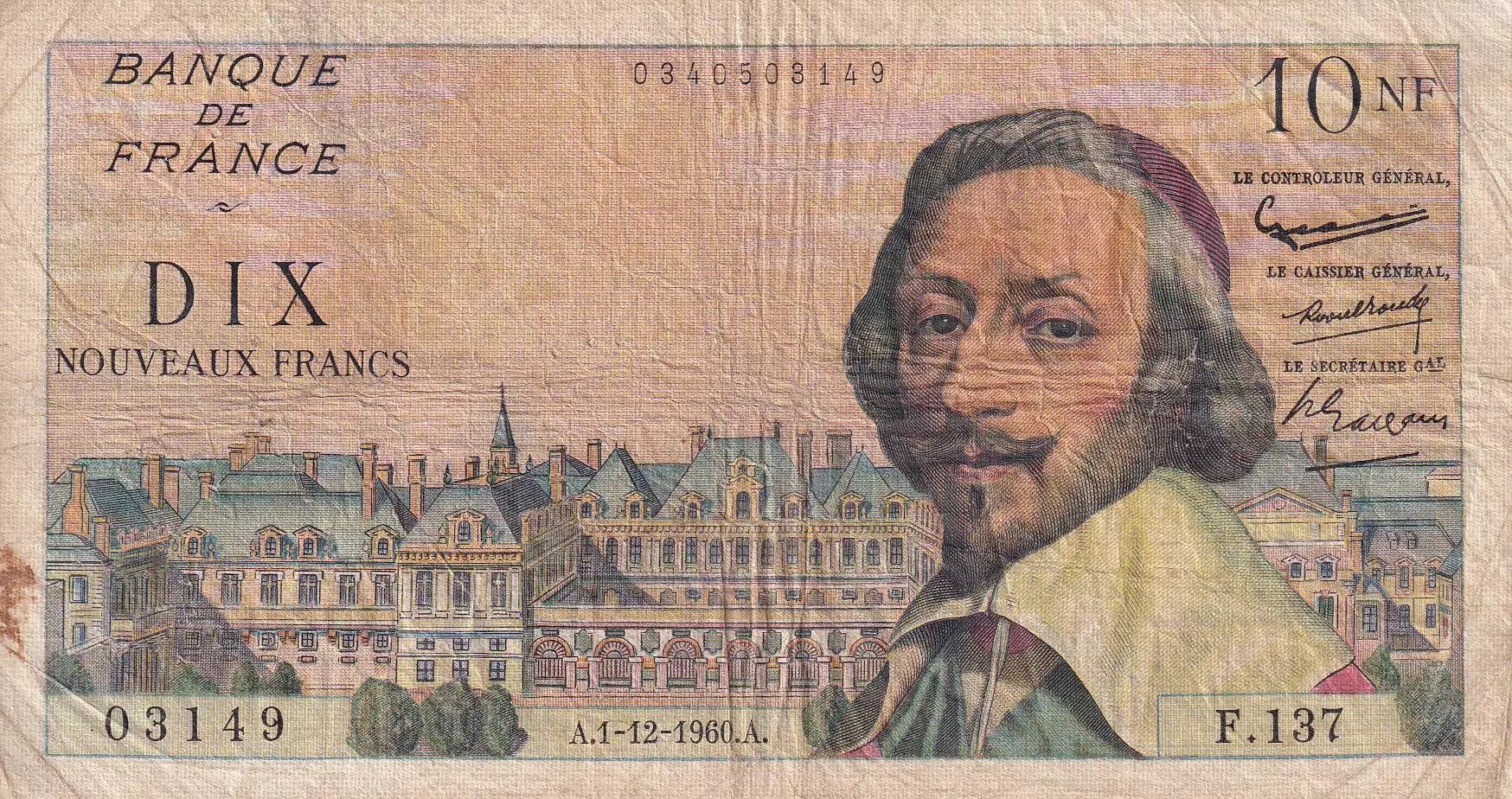 Banknote France 10 NF - Richelieu - 01-12-1960 - Serial F.137 - F - P.142