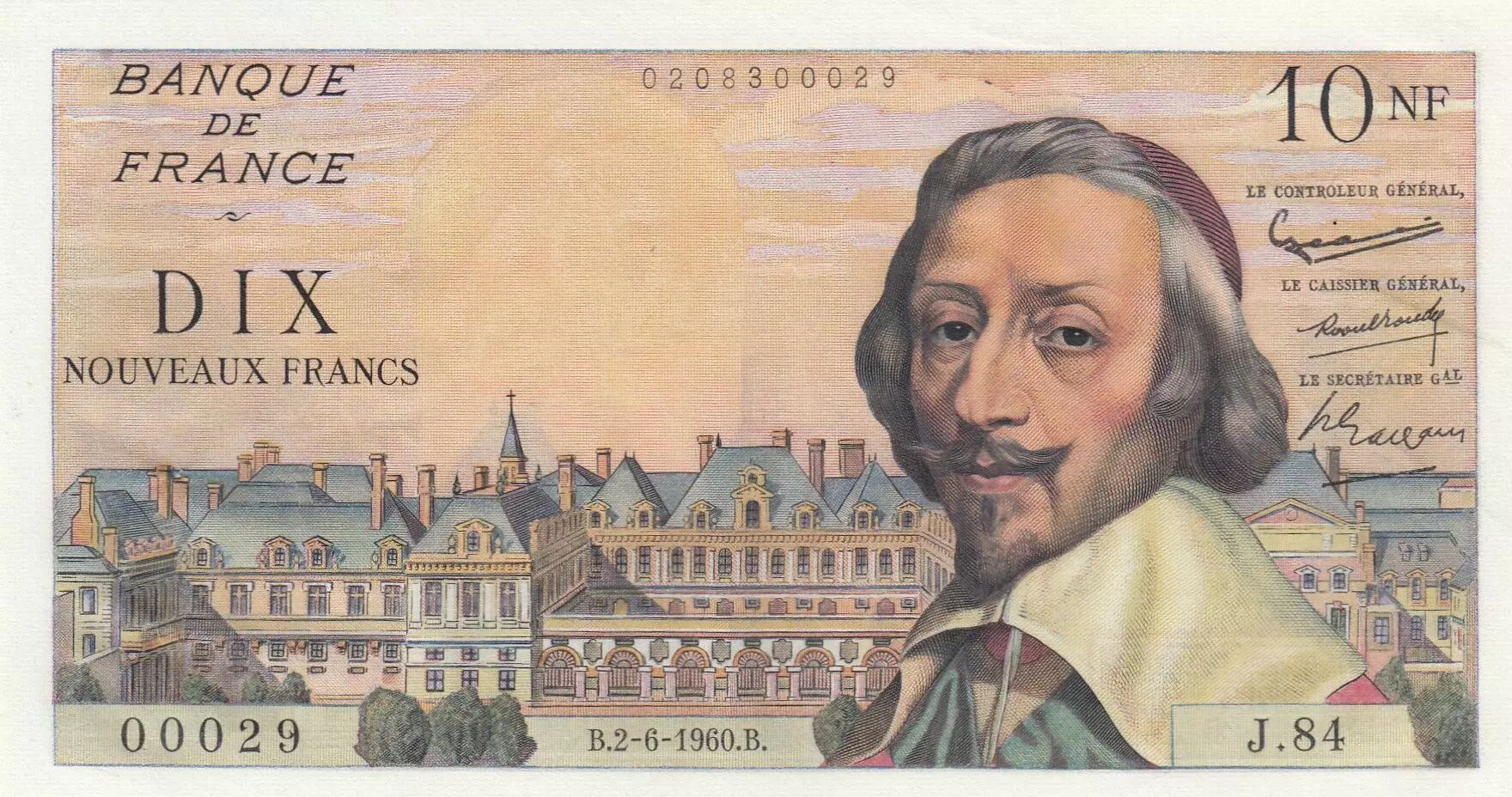 Accueil > Archivage > archivage-Billets Français > France 10 NF - Richelieu - 02-06-1960 - Série J.84 - Petit Numéro