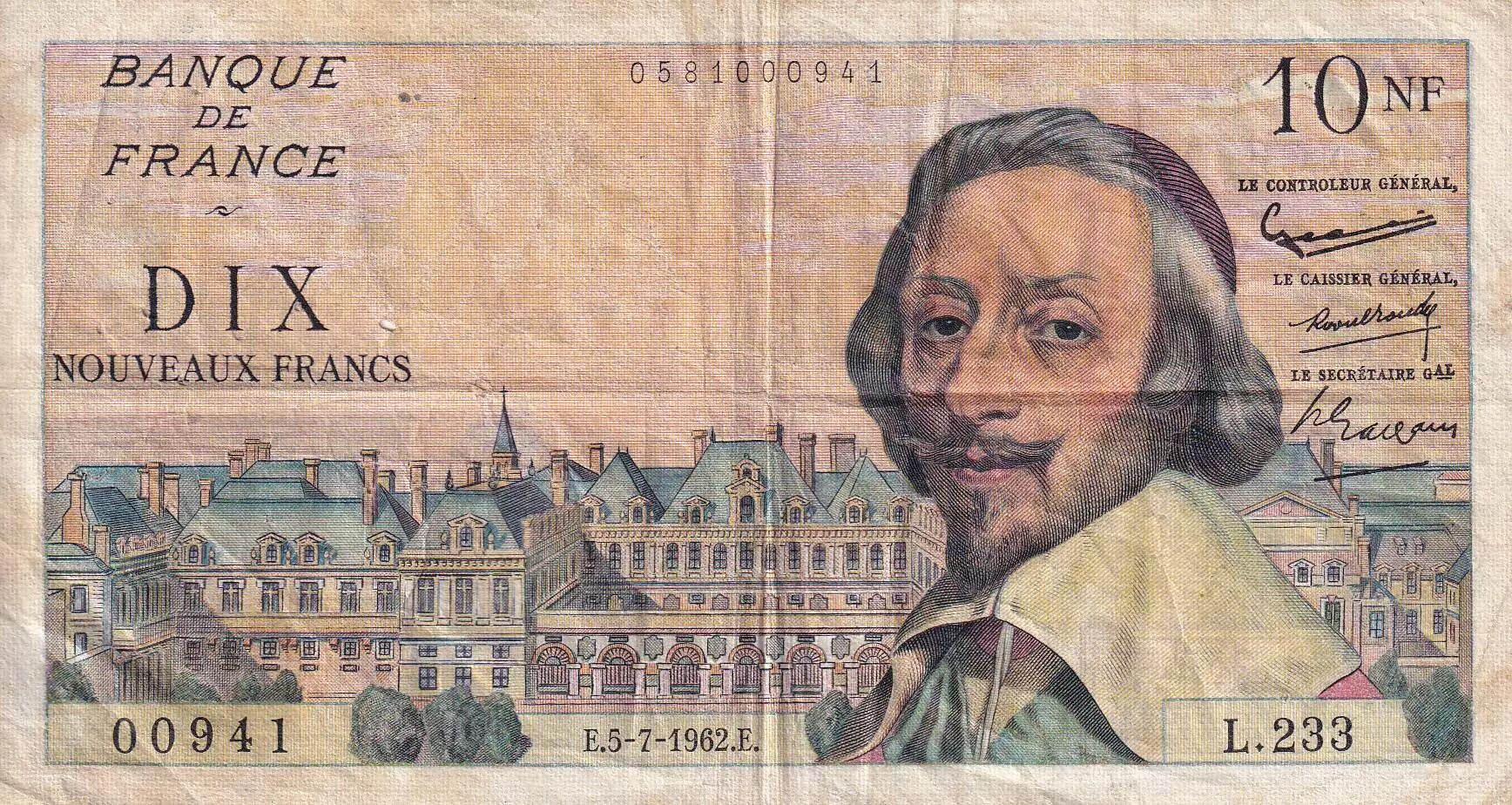 Home > > France 10 NF - Richelieu - 05-07-1962 - Serial L.233 - F to VF - P.142