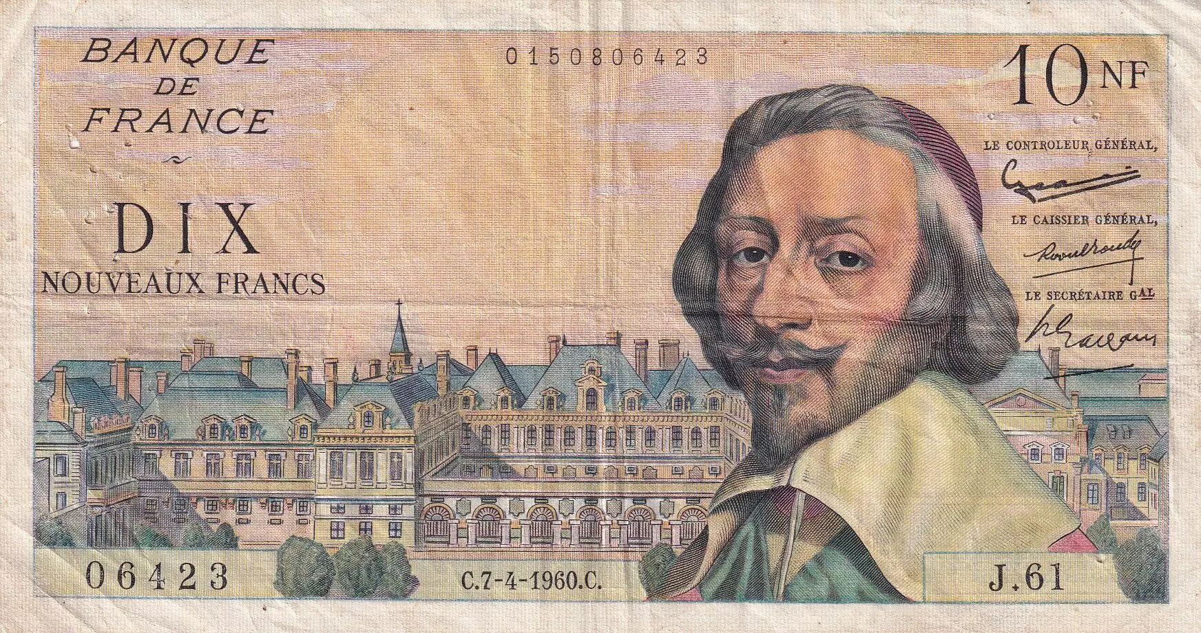 Banknote France 10 NF Richelieu - 07-04-1960 - Serial J.61