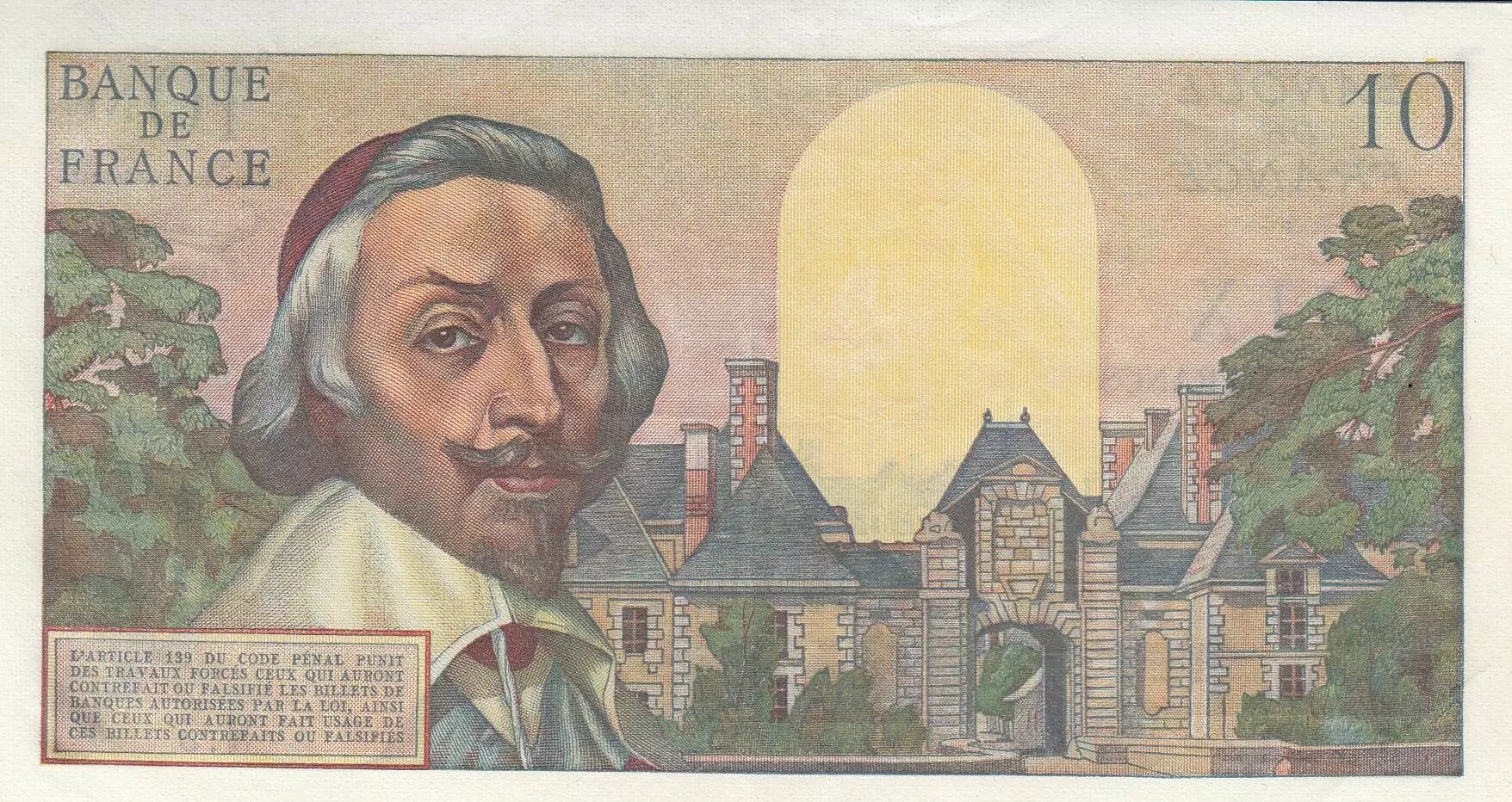 La valeur nominale du billet est de 10 francs, une unité monétaire qui reflète le système financier de la France à cette époque. L'iconographie du billet met en avant une figure historique importante, Richelieu, dont le portrait orne probablement l'une des faces du billet. La présence de Richelieu témoigne d'une volonté de lier la monnaie à des symboles forts de l'histoire nationale française.