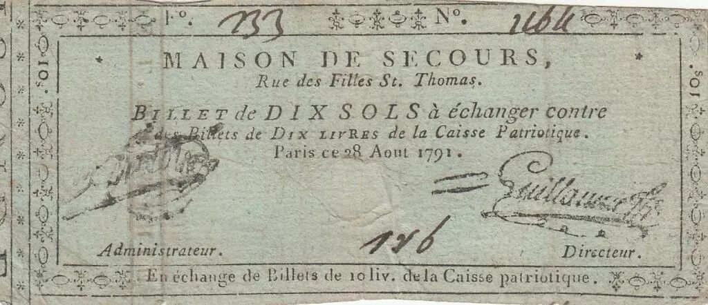 Banknote France 10 sols - Emergency home, rue des filles St. Thomas -1791