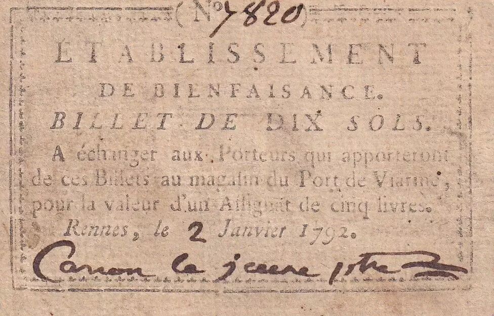 Banknote France 10 Sols - Ille et Vilaine - Rennes - Établissement de Bienfaisance - Janvier 1792