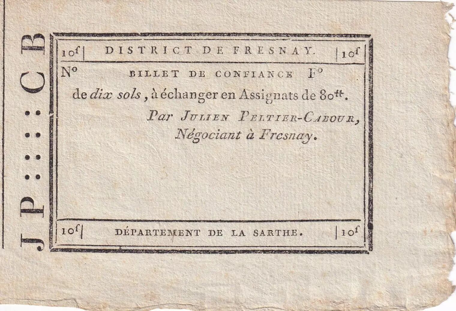 Billet France 10 Sols - Sarthe - District de Fresnay - Julien Peltier-Cabour Négociant - 1792