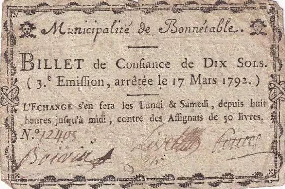 Billet France 10 Sols - Sarthe - Municipalité de Bonnetable - 17-03-1792