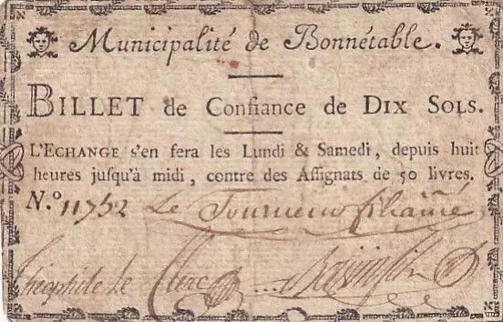 Banknote France 10 Sols - Sarthe - Municipalité de Bonnetable - 1792