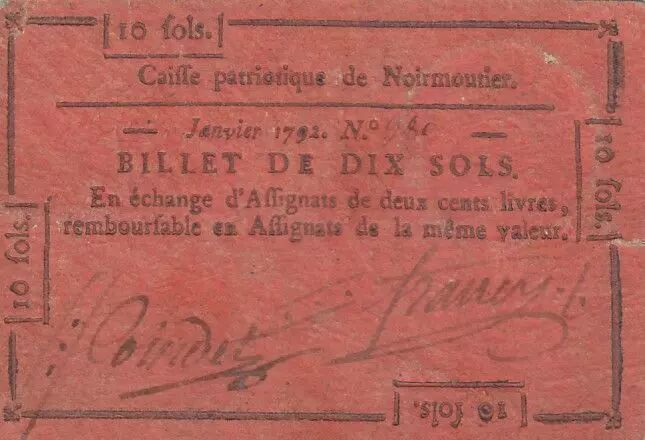 Billet France 10 sols - Vendée - Caisse patriotique Noirmoutier - Non retrouvé - 1792