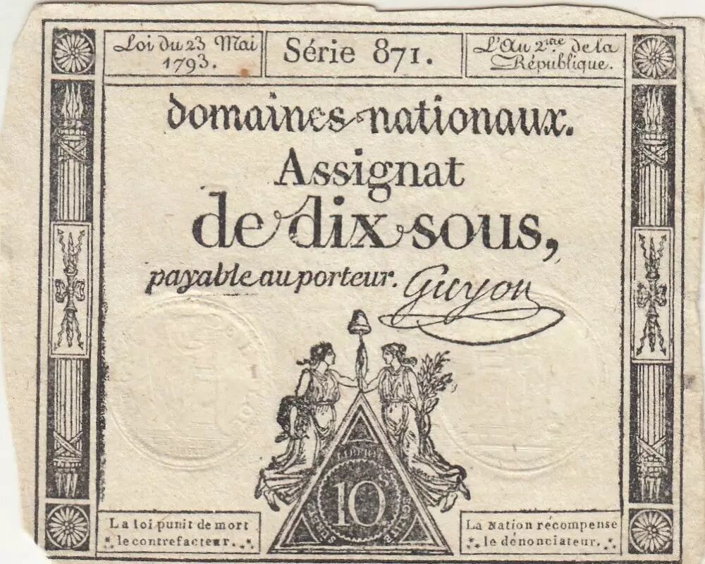 Billet France 10 Sous - Femmes - bonnet frigien - 23-05-1793 - Sign. Guyon - Série 871