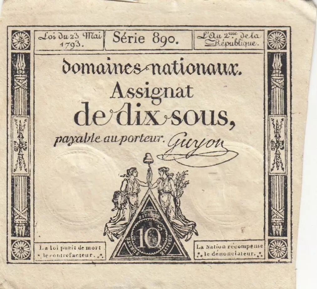Accueil > Billets Français > Assignats > 10 Sous > France 10 Sous - Femmes - bonnet frigien - 23-05-1793 - Sign. Guyon - Série 890