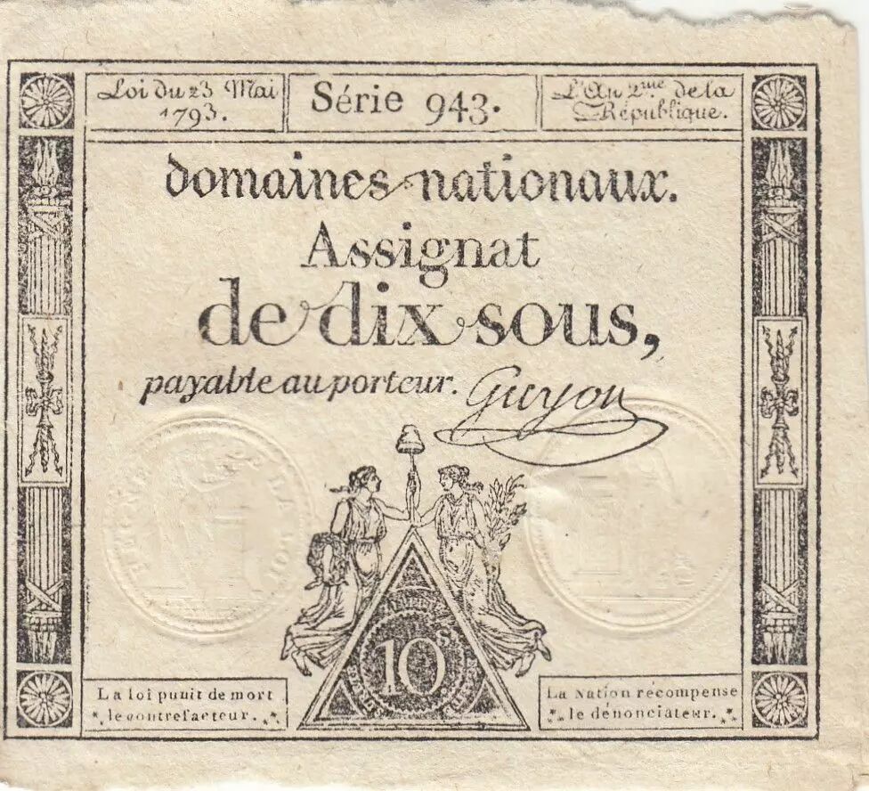 Accueil > Billets Français > Assignats > 10 Sous > France 10 Sous - Femmes - bonnet frigien - 23-05-1793 - Sign. Guyon - Série 943