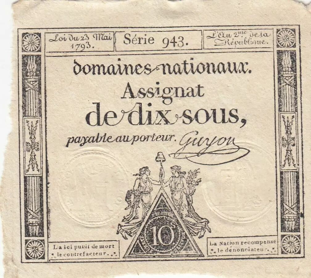 Accueil > Billets Français > Assignats > 10 Sous > France 10 Sous - Femmes - bonnet frigien - 23-05-1793 - Sign. Guyon - Série 943