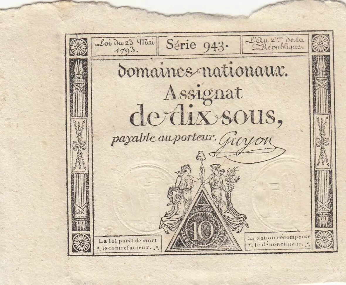 Billet France 10 Sous - Femmes - bonnet frigien - 23-05-1793 - Sign. Guyon - Série 943