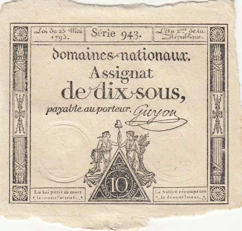Accueil > Billets Français > Assignats > 10 Sous > France 10 Sous - Femmes - bonnet frigien - 23-05-1793 - Sign. Guyon - Série 943