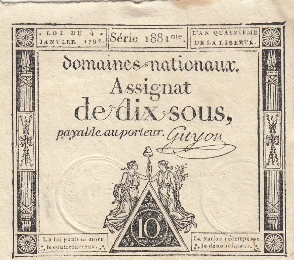 Billet France 10 Sous - Femmes - bonnet phygien - 04-01-1792 - Sign. Guyon - Série 1881
