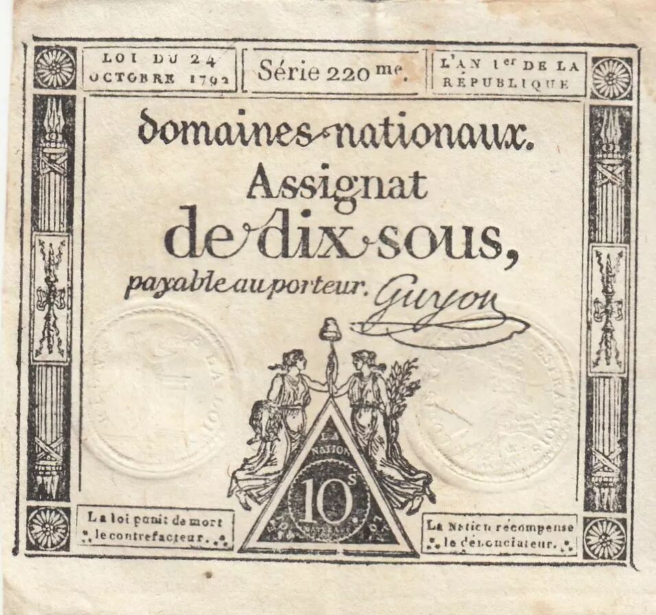 Billet France 10 Sous - Femmes - bonnet phygien - 24-10-1792 - Sign. Guyon - Série 220