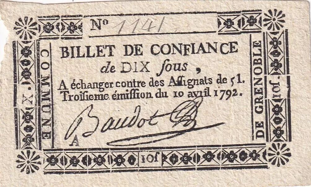 Banknote France 10 Sous - Isère - Commune de Grenoble - 1792