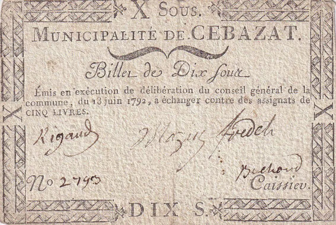 Billet France 10 Sous - Puy-de-Dôme - Cébazat - 1792 - TTB